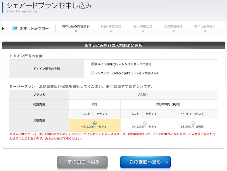 次の画面では、注文する時に必要なお金が表示されます。シェアードプランACE01は1年で49,248円(消費税8%時)かかります。問題なければ「確認する」ボタンで次へ進んでください。